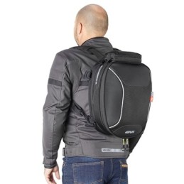 La tasca sul fondo contiene un sistema di spallacci e una patella imbottita che, coprendo la flangia tanklock, permette alla borsa di diventare zaino